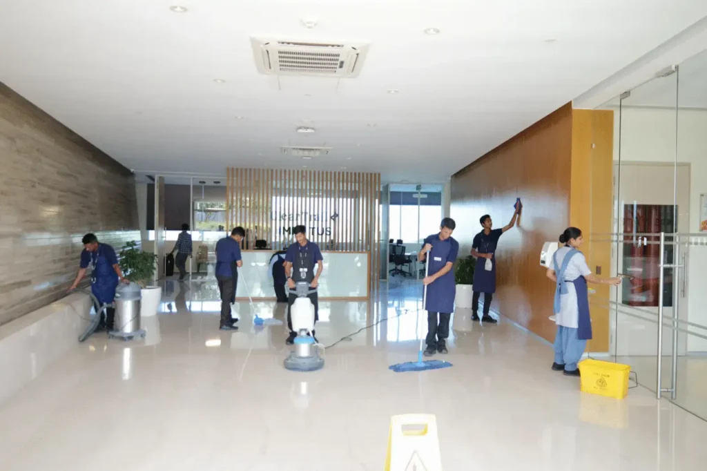 • Office and Workplace Cleaning: Comprehensive office and workplace cleaning ensures sanitised workstations, organised common areas, hygienic restrooms, and spotless meeting rooms, improving productivity, employee comfort, and overall workplace appearance, delivered by trained housekeeping personnel.